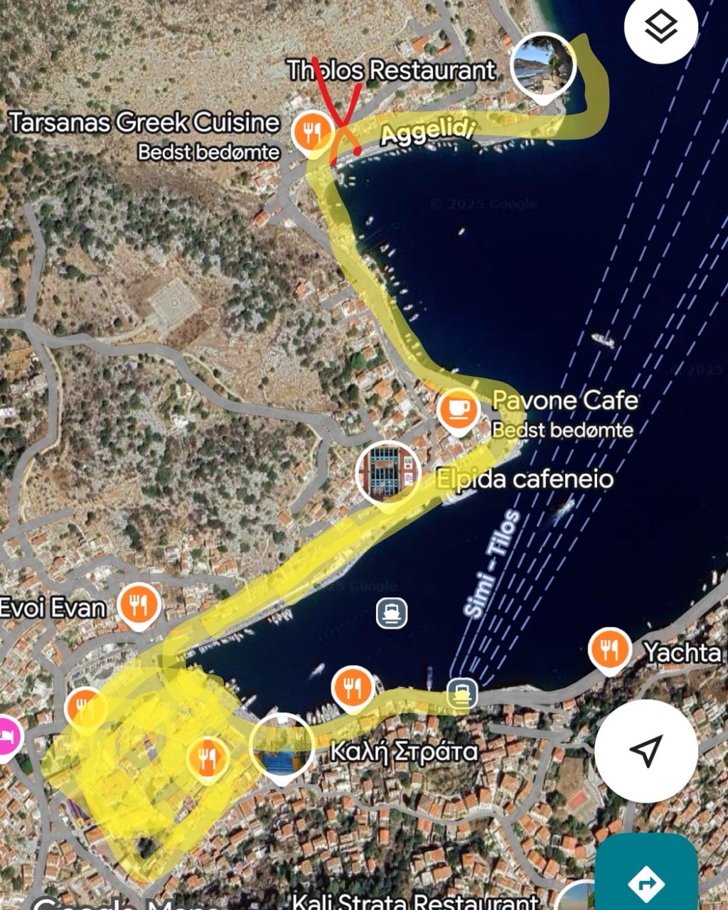 Den gule linje viser, hvor det anbefales at booke overnatning. Tæt på havnen i og omkring Ghialos by.